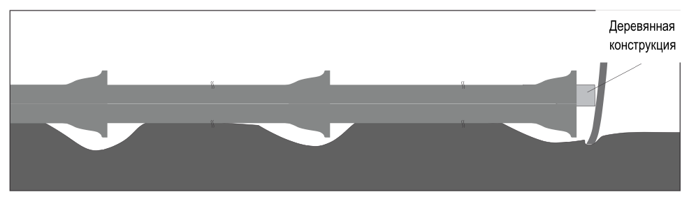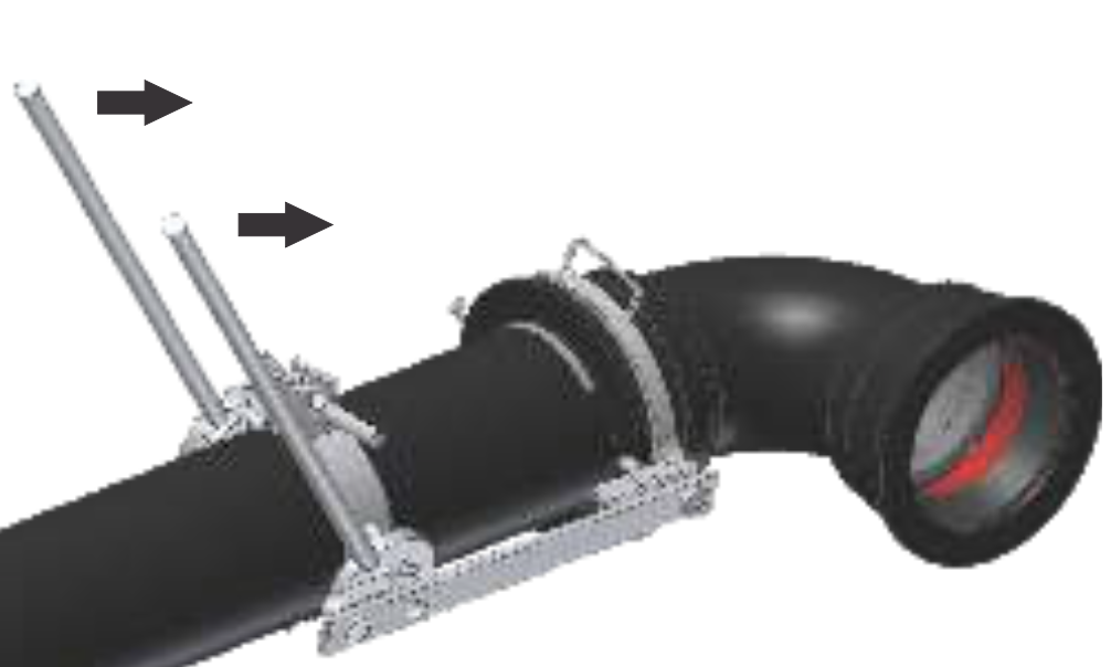 Вилочный инструмент можно использовать для сборки трубных соединений DN100–DN150. Вилка устанавливается поверх и позади муфты последней проложенной трубы. Как показано на рисунке, проволочный трос с проушиной на одном конце и крюком на другом, подсоединяется к муфте соединяемой трубы. Рукоятка вилки тянется в направлении стрелки, и конец трубы входит в муфту. При этом необходимо приложить разумное усилие.