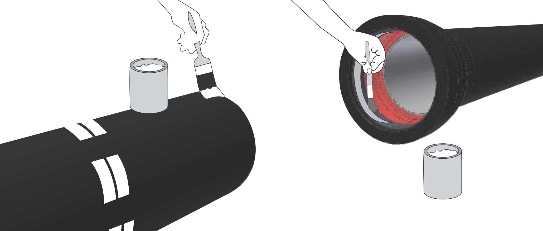 Передние 150 мм муфты должны быть тщательно очищены. Смазку следует наносить кистью на открытую поверхность уплотнителя, которая будет контактировать с концом трубы, в канавку муфты и на конец трубы примерно на 50 мм тонким слоем. Используемая смазка должна быть только той, которую поставляет производитель труб. Не допускается соприкосновение конца трубы с землёй или траншеей после смазки.