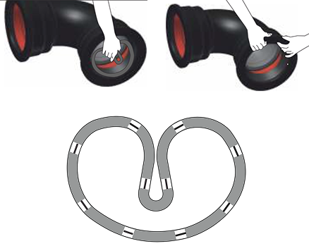 Соединения могут быть отклонены в любом направлении до 5° для труб до DN300, до 4° для DN350–800, до 3° для DN900–1600 и до 2° для труб DN1800–2200. Все гладкие концы должны быть скошены. При соединении трубы всегда должны быть на одной линии, и, при необходимости, отклонение следует производить после соединения.